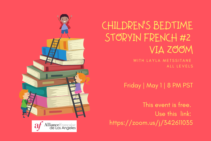 As we are required to stay home, actress Layla Metssitane partners with the Alliance Française de Los Angeles, Sacramento and Silicon Valley to do a children’s read aloud in French via zoom. This will last 30 minutes and is free of charge.