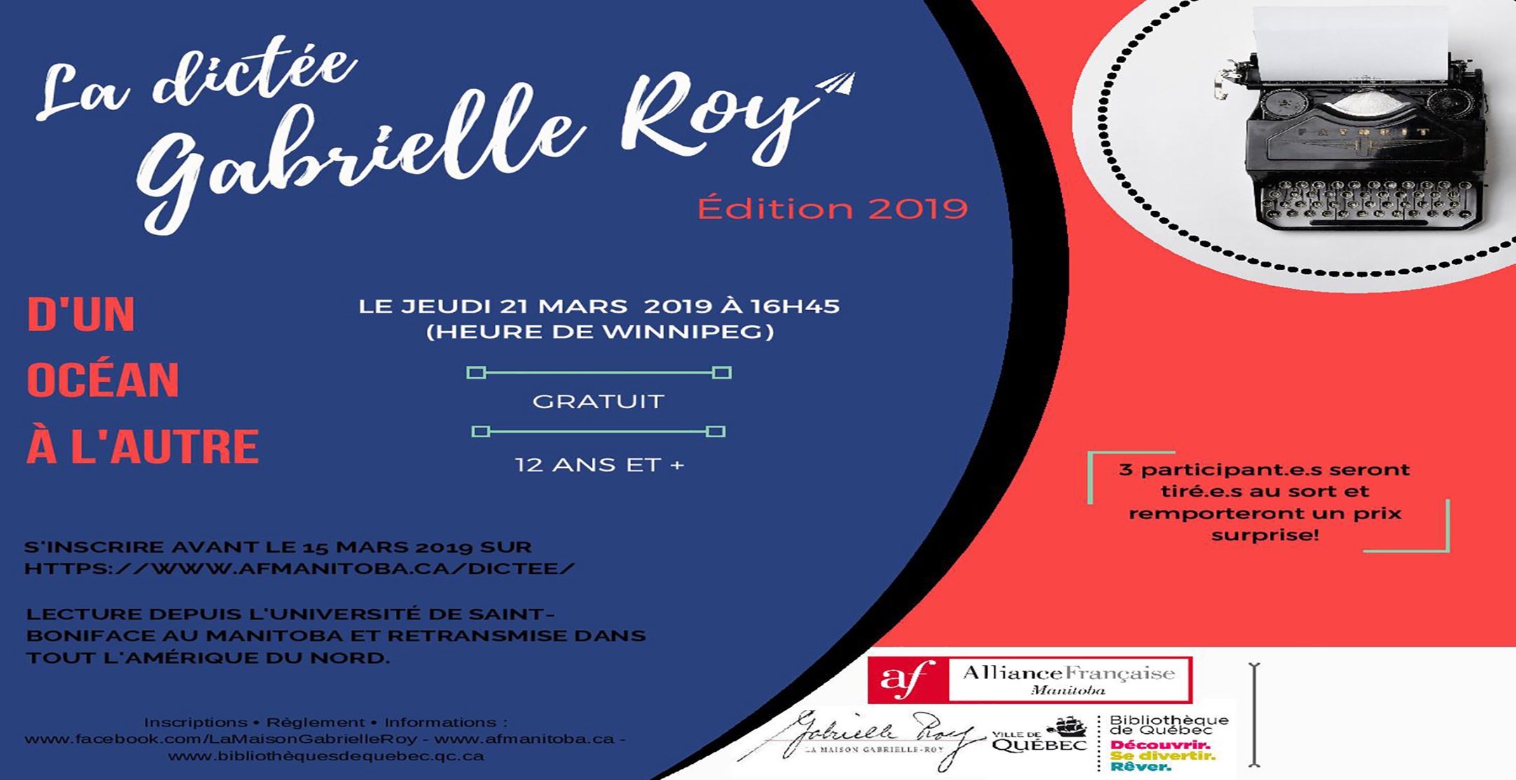 The Alliance Française de Los Angeles, in partnership with The Alliance Française du Manitoba, La Maison Gabrielle Roy, La Bibliothèque Gabrielle Roy de la ville de Québec and Le Réseau des Alliances Françaises, invites you to the “Dictée Gabrielle Roy”, édition 2019!