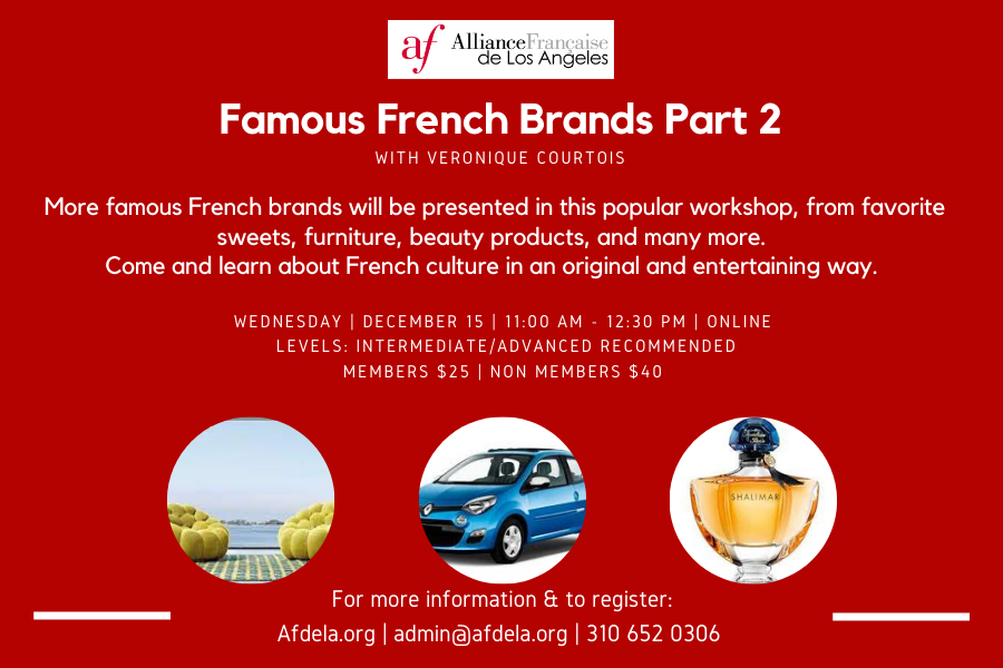 More famous French brands will be presented in this popular workshop, from favorite sweets, furniture, beauty products, and many more. Come and learn about French culture in an original and entertaining way.