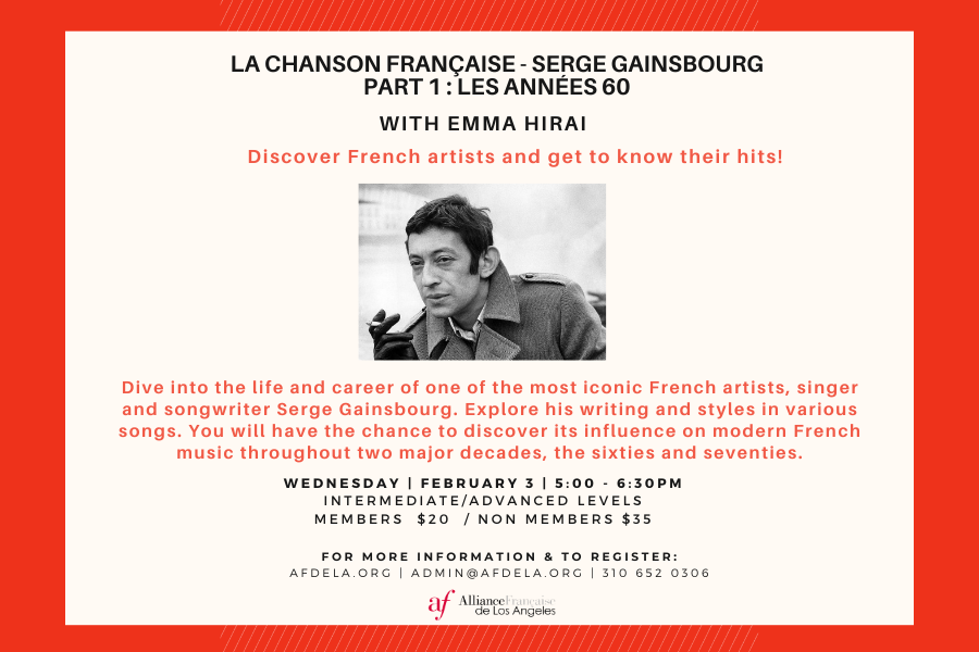 Dive into the life and career of one of the most iconic French artists, singer and songwriter Serge Gainsbourg. Explore his writing and styles in various songs. You will have the chance to discover its influence on modern French music throughout two major decades, the sixties and seventies.