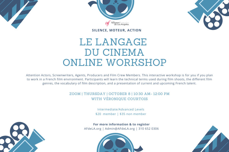 Attention Actors, Screenwriters, Agents, Producers and Film Crew Members. This interactive workshop is for you if you plan to work in a French film environment. Participants will learn the technical terms used during film shoots, the different film genres, the vocabulary of film description, and a presentation of current and upcoming French