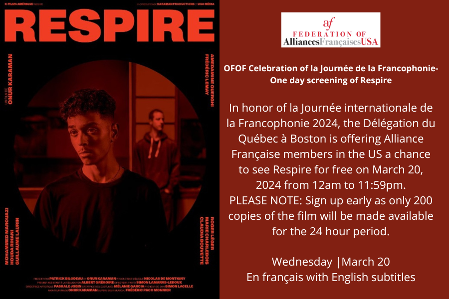 In honor of la Journée internationale de la Francophonie 2024, the Délégation du Québec à Boston is offering Alliance Française members in the US a chance to see Respire for free on March 20, 2024 from 12am to 11:59pm. PLEASE NOTE: Sign up early as only 200 copies of the film will be made available for the 24 hour period.
