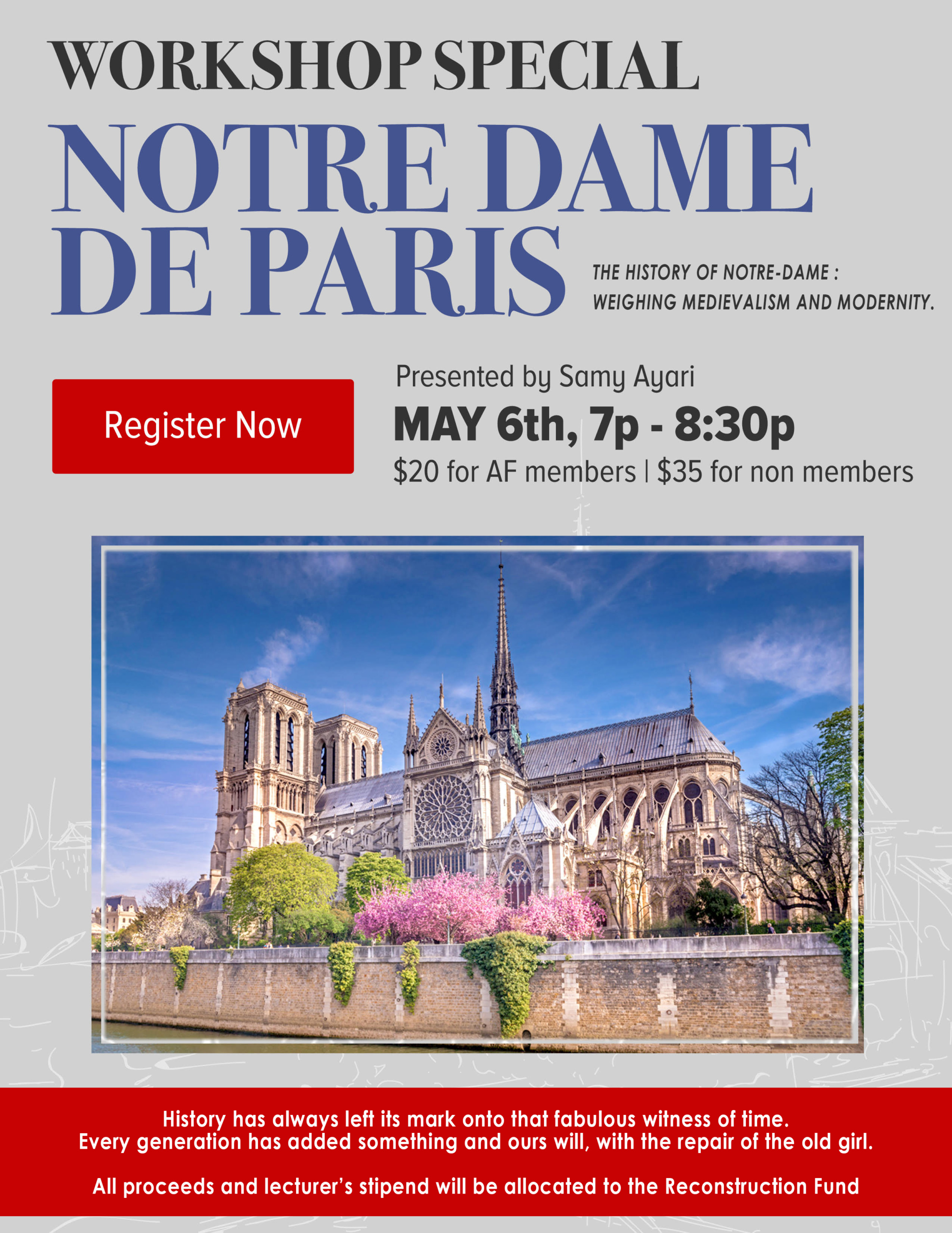 All proceeds and lecturer’s stipend will be allocated to the Reconstruction Found of Notre Dame.
