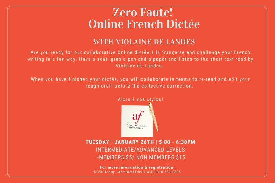 Are you ready for our collaborative Online dictée à la française and challenge your French writing in a fun way. Have a seat, grab a pen and a paper and listen to the short text read by Violaine de Landes.
