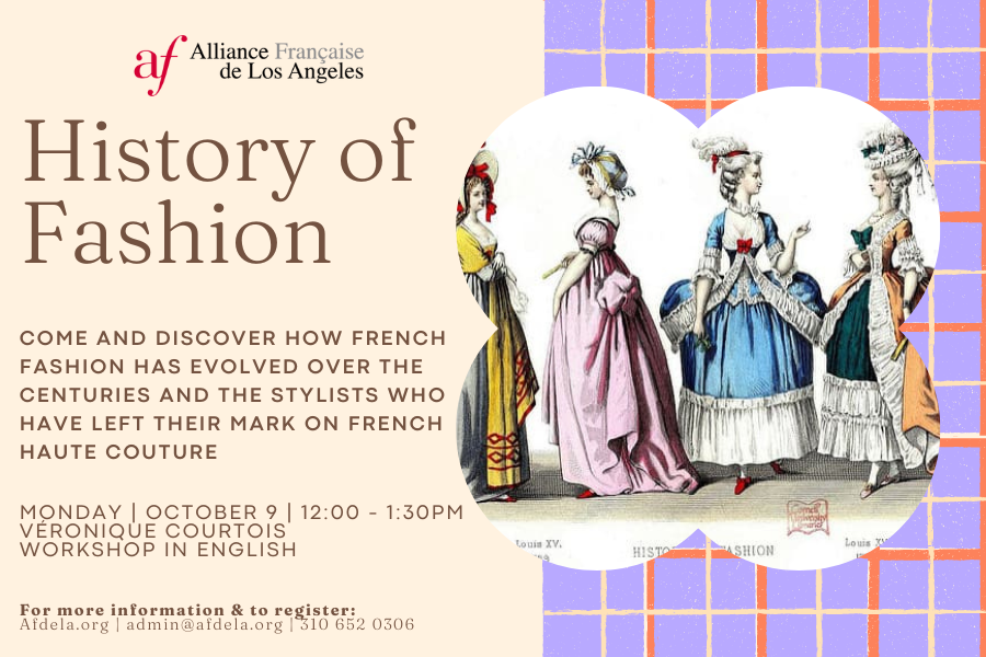 Register Here!  Come and discover how French fashion has evolved over the centuries and the stylists who have left their mark on French Haute Couture. MONDAY | OCTOBER 9 | 12:00 - 1:30PM