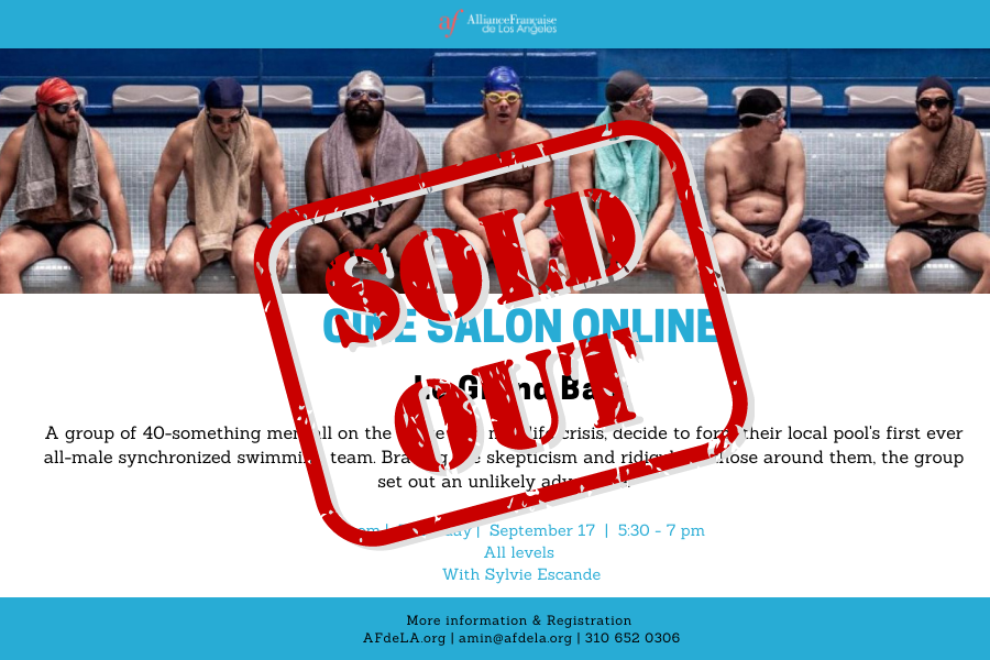 Register here CINE-SALON ONLINE Le Grand Bain: A group of 40-something men, all on the verge of a mid-life crisis, decide to form their local pool's first ever all-male synchronized swimming