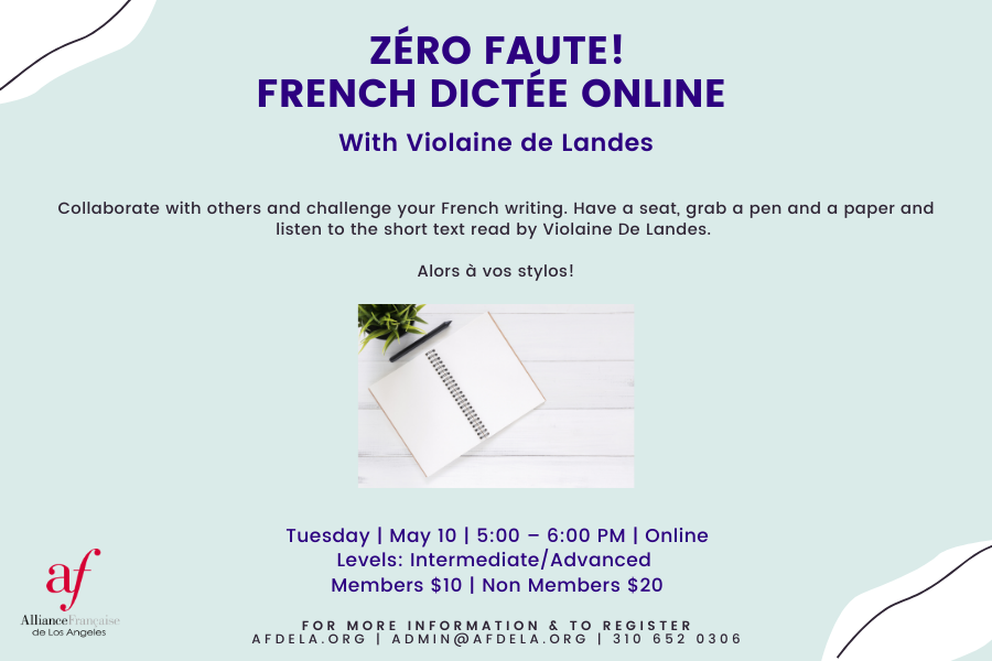 Register here! Collaborate with others and challenge your French writing. Have a seat, grab a pen and a paper and listen to the short text read by Violaine De Landes.