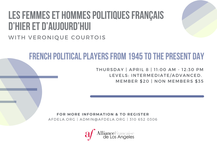 Register here! French political players from 1945 to the present day. Thursday | April 8 | 11:00am-12:30 pm Levels: Intermediate/Advanced. member $20 | non members $35 With Veronique Courtois