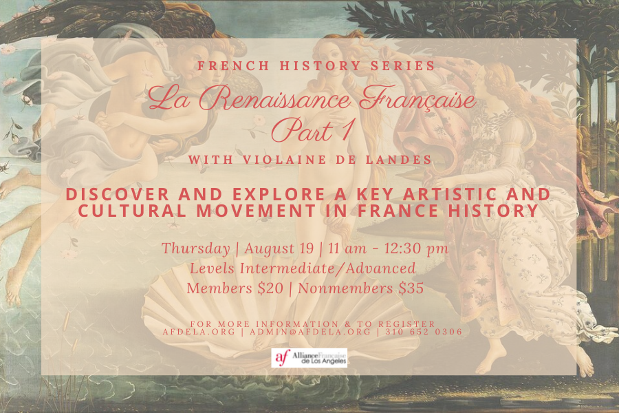 Register here! Discover and explore a key artistic and cultural movement in France History Thursday | August 19 | 11 am - 12:30 pm Levels: Intermediate/Advanced Members $20 | Nonmembers $35